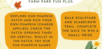 Come and visit us this October for lots of fun on the farm. Our pumpkin patch will be open from Saturday 18th October until Friday 31st October (park closed Wednesday 22nd). The patch will be open from 11am-12.30pm and 2-3.45pm with the exception of … [Read more...] about Autumn fun on the farm..